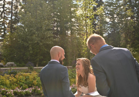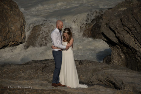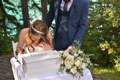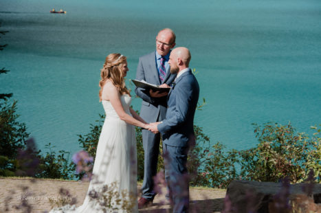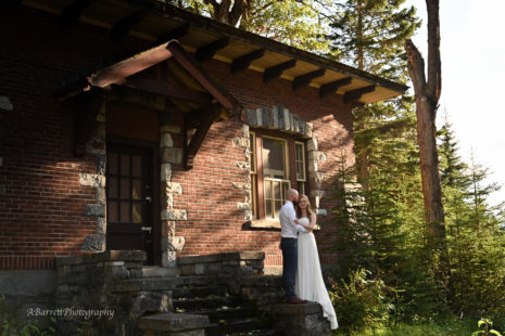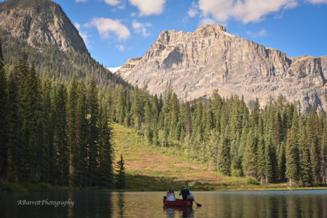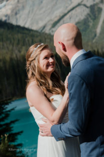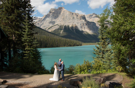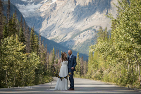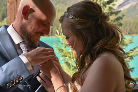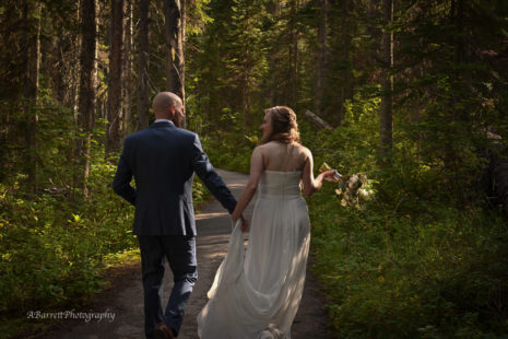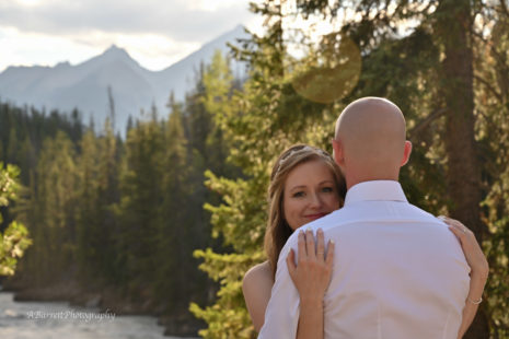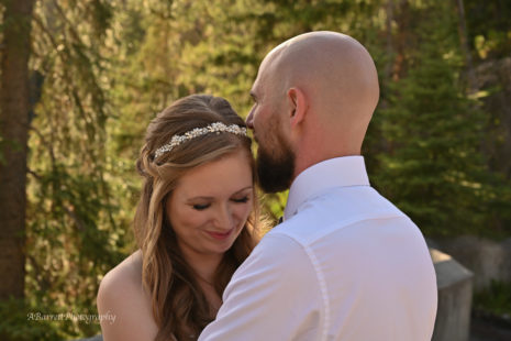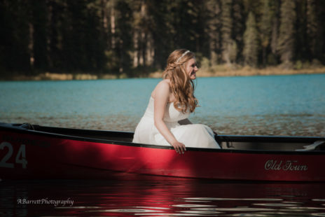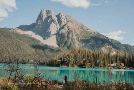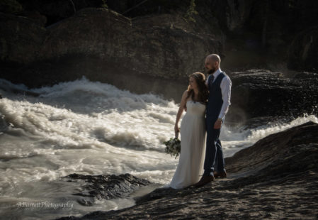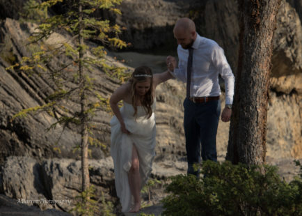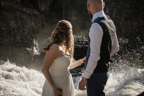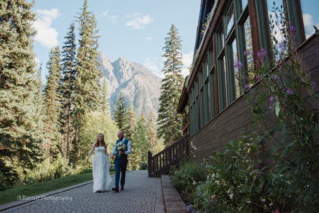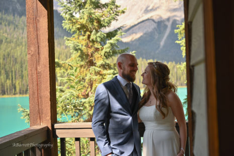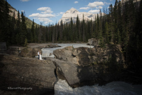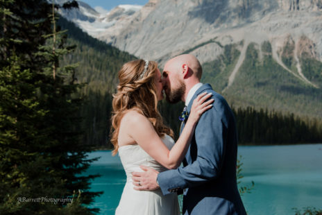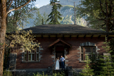 Emerald Lake Lodge in Yoho National Park is a beautiful romantic location for elopements. Kirsty and Jamie traveled from Scotland to share their vows with each other surrounded by Rocky Mountains in this magical place. They each wore a thistle to have a wee bit of Scotland close to their hearts. Kirsty and Jamie had written letters to one another and placed them in a box with a bear and a Canoe. They will open them on their tenth anniversary. I wonder if they can wait that long. After their quaint ceremony we walked to the boat house where the couple rented a canoe. Neither one of them seemed overly comfortable being in a boat but they still had a good time. Blessed with a stunning day we made the most of the setting sun. Kirsty and Jamie wanted to see the Natural Bridge and capture a few portraits there as well. The Kicking Horse river was flowing fast under the bridge and standing close you could feel its power. We then traveled into the Village of Field to use one of the heritage buildings as a back drop. An old building for Canada is still fairly new in Scotland. This is their first time in Canada and they plan to travel around before they head home.